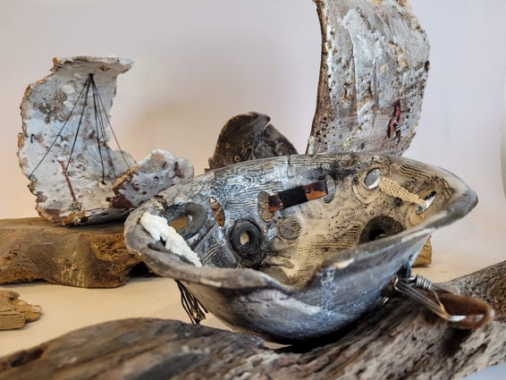 Each piece is embellished with copper, textile and thread to enhance the ceramic marks and textures.