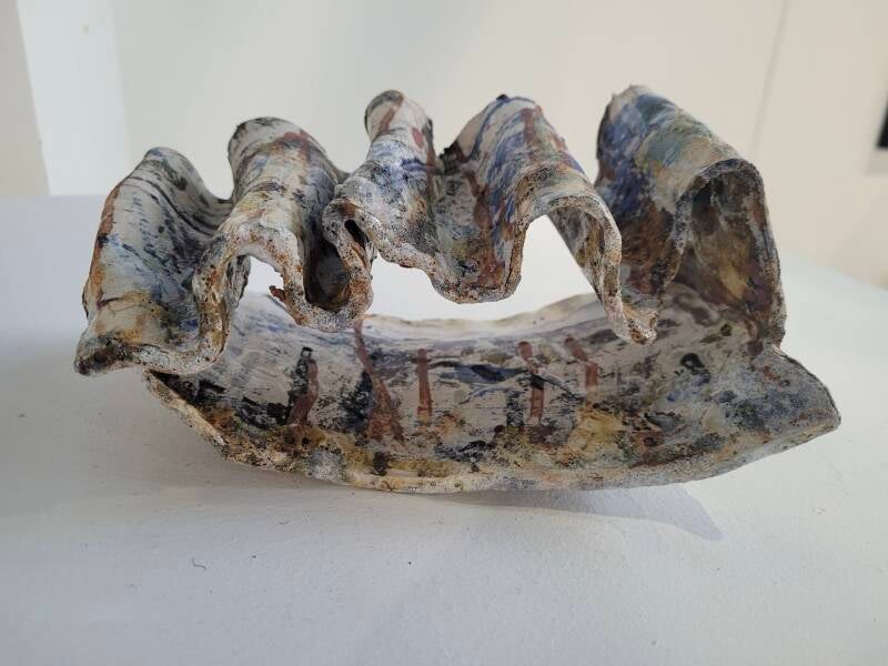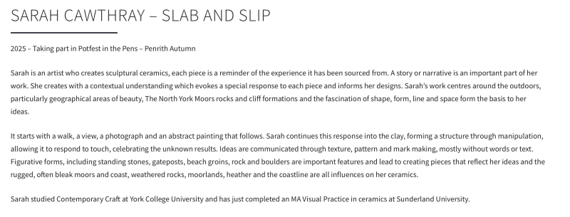 In recognition of great friendships, I have explored these ideas through my work as a ceramicist. By using clay as a metaphor for friendships and the 109-mile, 10-day, Cleveland way walk which took place over 2023 and 2024 accompanied by the same two dear friends who have joined me on many other walks. The changing lines and creative structure of each piece I will make will not only represent the ups and downs of life but also the challenging walks we do together. The support the clay gives in creating the form is the support friendships give during the walk and throughout life. I wanted to create pieces that reflect the landscape, the boulder, the standing stone, but also to resonate the true meaning of walking with friends and how that impacts on my life as a ceramicist.